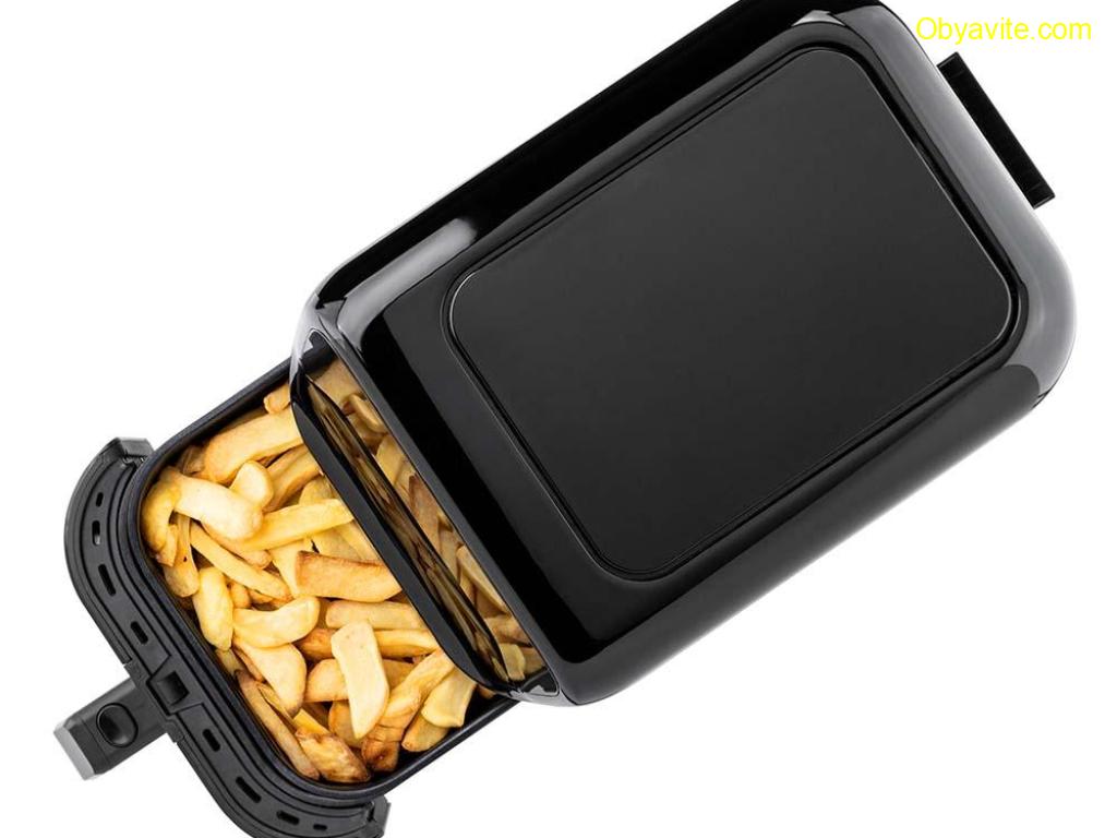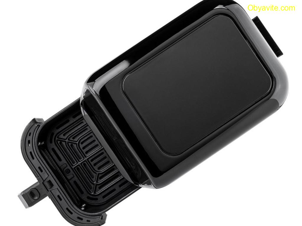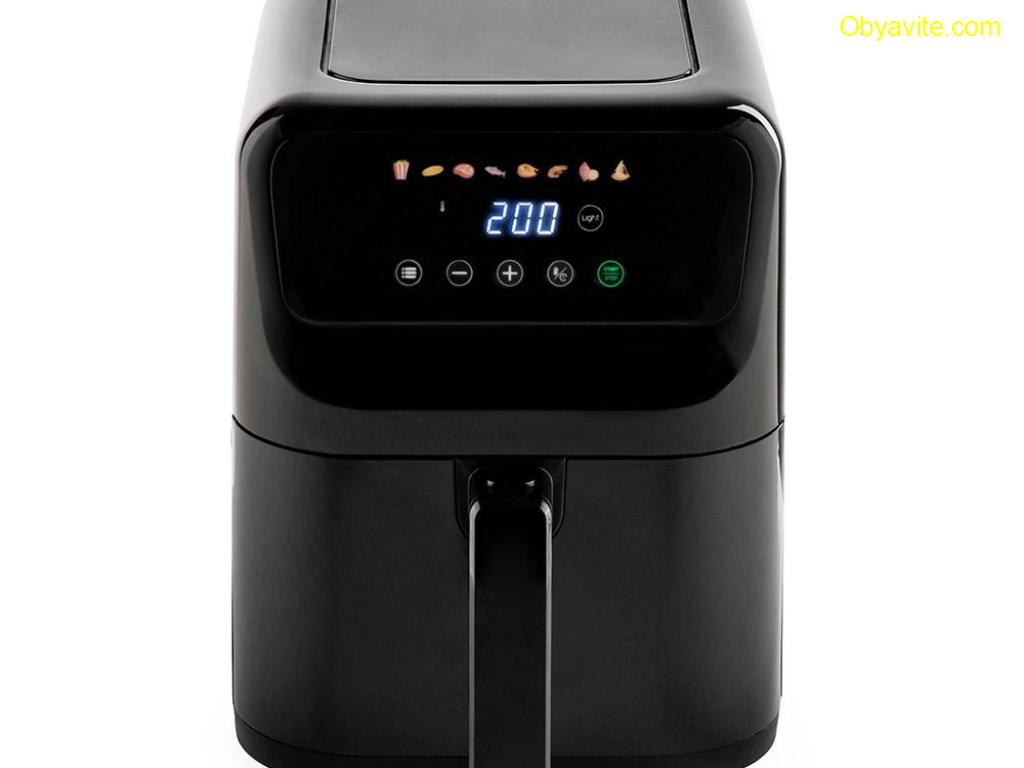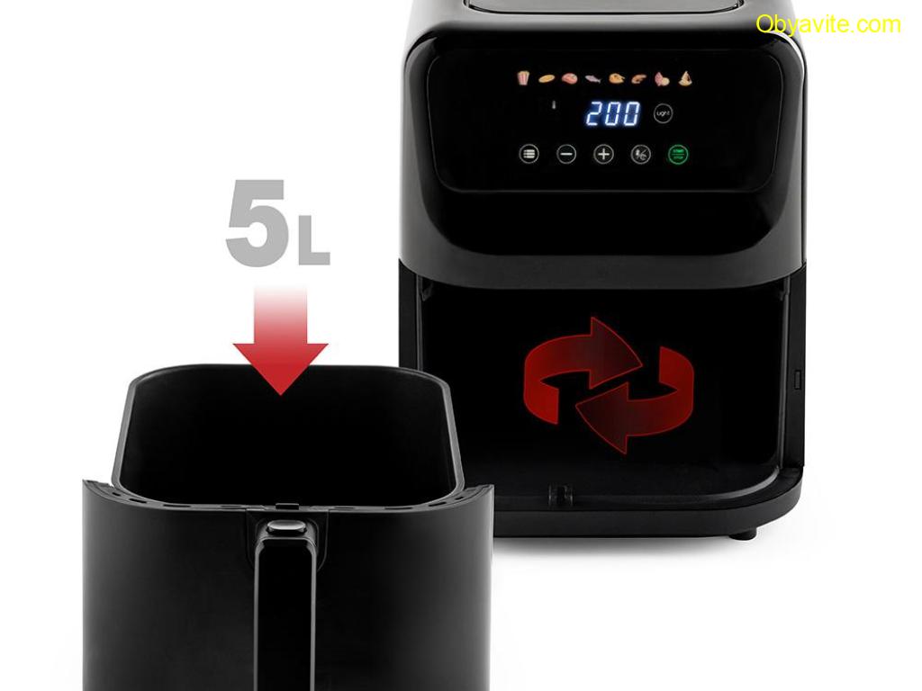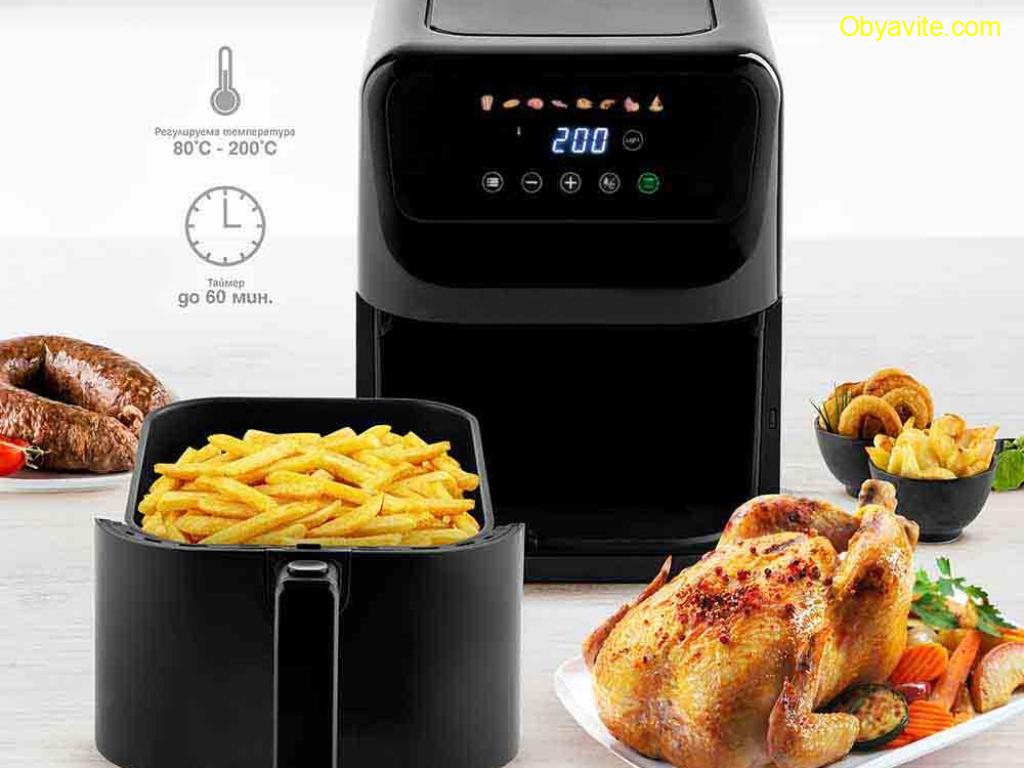 Нов дизайн на уреда за пестене на място в кухнята, при повече обем за готвене Общ/ полезен обем – 5/ 4.6 л Регулиране на температурата - от 80 до 200 градуса Кошница и грил решетка с незалепващо покритие Топлоизолиран корпус 60-минутен таймер Цветен сензорен LED дисплей за управление 8 предварително зададени програми за готвене - пържени картофи, пържола, пиле, сладки картофи,,торта, риба, скариди, пица, и още много възможности според вашето въображение Енергийно-ефективно, здравословно, бързо и лесно приготвяне на ястия без мазнини с изключителен вкус и аромат Нагревател от неръждаема стомана Наблюдателно прозорче Осветление на отделението за печене с автоматично изключване след 30 секунди Функция за готовност/ пауза 3-минутно автоматично изключване при бездействие Звуков сигнал Защита от прегряване Крачетa против хлъзгане Дължина на захр. кабел – 1 м Размери на уреда (В/Ш/Д): 288*228*399 мм 1500W, 220-240V/ 50-60 Hz