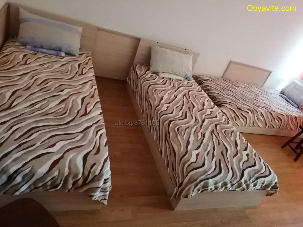 Обзавеждането на студиото е: 3 ЛЕГЛА, гардероб, маса, четири табуретки, готварска печка, хладилник, климатик, телевизор.